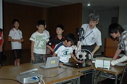 科学の時間では、五百円玉のゼロの文字の中や、お札に小さく記されるマイクロ文字を顕微鏡で覗いたり、磁石や電気を通すかなどの実験が行われ参加者は皆、興味津々の表情。