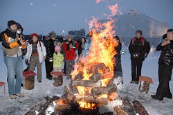 旭川冬まつり会場内で期間中の毎日夕方から、一メートルほどの高さに組まれたやぐらで焚き火が行われた。その周りには暖を取ろうと大勢の来場者が集った。