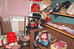 バッグや洋服、食器、雑貨小物など手作りならではの温かみのある作品を展示販売中だ=写真。ニットの洋服や手織りのスートールなど、この春お勧めの商品ばかり。カギ入れや小銭入れ、コースターなどの小物も数多く揃えている。
