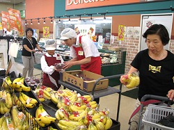 五人ずつ八百屋さん、肉屋さん、魚屋さん、惣菜屋さんの四班に分かれ、店内への品出しの準備から仕事をスタートした。八百屋さんの班に入った野村 和裕さん(10・小学五年生)は「お母さんが申し込んだけど、楽しみにしている」と少し緊張しながら、ブドウやバナナを陳列棚に並べていた。