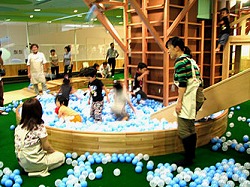 この日、市立新旭川保育所の児童四十二人が、森の中をイメージした空間に設置された「ぼうけんはうす」「かくれんぼとんねる」「森のいずみ」「こ ろころくるりん」「きっちんはうす」などの遊具で、遊び回った。遊具は木のまち・旭川の特徴を活かすため、地元の家具メーカーなどに特注したものも多く使 われている。遊具間の間隔も広く、約百人の保護者と児童が遊ぶことができる。授乳とオムツ替スペースもある。