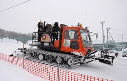なだらかな斜面にはロープトウが設置され、初心者向けのゲレンデが作られている。スキーやボードのレンタル(各千円)も行っており、その場ですぐ に体験も可能だ。頂上までは圧雪車の周遊コース(中学以上五百円・小学以下二百円)が続いている。頂上からは市内が一望でき、記念写真を撮る家族も多い。