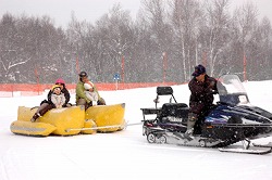 スノーモービルが牽引するスノーバナナとスノーラフティング(中学以上四百円・小学以下二百円)はスピード感たっぷりのメニュー。この日体験試乗した感想は、顔面で受けるスピード感やゲレンデを滑り降りる際のフワッと体が浮かぶスリルにいい歳をして大騒ぎしてしまった。