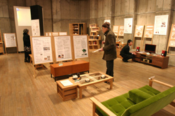 色彩デザイン科は「就職希望エリアに向けての提案」を題材とし、産業機械メーカーのクボタのキャラクターを使用した店頭ディスプレイなど、実践的 な作品が展示されています。造形デザイン科は「時代のニーズ」を題材に、同学院が誇る高い技術力で製作された家具など木工作品が並んでいます。