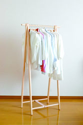 コートを掛けたり、翌日着る予定の服を用意したり、羽根布団を干したり…、ドレスラックは多用途。たためば厚さは七㌢とコンパクト。軽いから家の中のどこでも移動が可能。もちろん、デザイン性に優れ、インテリアとしてリビングに置いてもサマになる。
