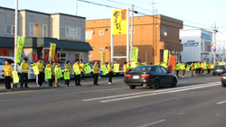 春の交通安全の最終日となった十五日夕方、リボン代行(石内秀一社長)と旭川東警察署が、通行する車に安全運転を訴える旗の波の活動とパトライト作戦をおこなった。