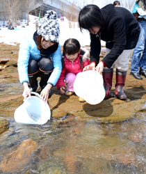 寺島代表はあいさつの中で、昨年秋に多くのサケが遡上しツインハープ橋付近で産卵したことに触れ、「二百以上の産卵床が出来たと思われます。一つ の産卵床には約三千の卵があります」「今年は五十万尾もの稚魚を放流してから四年目の年ですが、去年の数倍の数のサケが帰ってくるものと予想されます」な ど、子どもたちにも分かりやすく説明した。