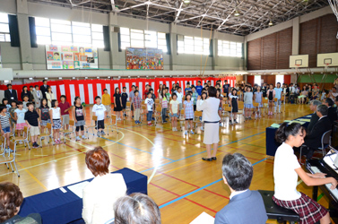 当日は全校児童が出席して体育館で式典が行われた。前田明美校長は式辞の中で「百二十年の歴史の中に、僕、私が学んでいるのは、何と素晴らしいことでしょう」と児童たちに話しかけていた。