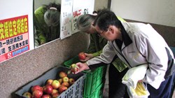 リンゴとナシは深川市納内の荻原果樹園産で、トマトは市東鷹栖のルーテル・ガーデン産だ。リンゴはつがる、ナシは千両、トマトは桃太郎で、味はお客さんの折り紙つきだという。値段はリンゴ一個五十円、ナシ一個百円、トマト一袋(一㌔)三百円、二袋五百円。