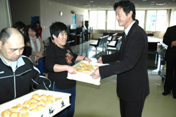 愛育センター(西田昭夫所長)では、利用者約八十人と職員五十三人に二百七十個が運び込まれ、プレイルームで金社長から利用者に直接手渡された。
