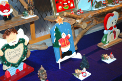 トールペイントやアートフラワーなどのクリスマスグッズが並ぶ。石粉粘土で作った壁飾りや和布で作った小物も可愛い。手軽に飾れて、手作りならではの温かさが伝わる作品ばかりだ。