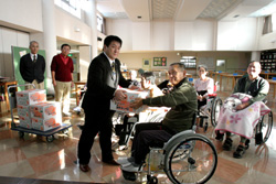 春光台の障害者支援施設・敬愛園(板谷征一園長)には、同社の大西弘幸次長ら二人が、隣接する敬生園、敬心園の分も合わせて十㌔入り六箱を届けた。