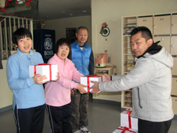 市内神居町富沢の障がい者支援施設・旭川ねむのきの園(古山慶一施設長)では、入園者三人が高橋さんを迎えケーキを受け取った。
