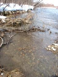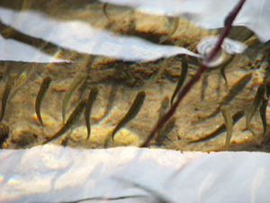川辺にはまだまだ深い雪が残っている浅瀬で、稚魚たちは海に下る準備をしているかのようだ。