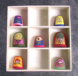 今展では澤田さんが韓国で集めた閨房工芸のコレクションの一部を展示している。カラフルな色遣いで、中でも指ぬきは地方によってデザインに様々な特徴がある。昔は嫁入りの時、手作りした指ぬきを百個持参して、嫁ぎ先の両親や親戚にプレゼントする習慣があったという。