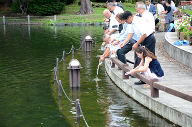 閉会後、命を繋ぐという気持ちを込め、参列者全員で金魚や鯉の稚魚を公園内の千鳥ヶ池に放流した。