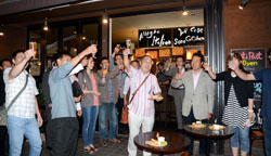 初日二日の午後六時半、参加店のマチバル(二条買物公園)には食の元気隊のメンバーら約四十人が集結。オープニングセレモニーには西川将人旭川市長も駆けつけ、伊藤友一隊長の「皆さん楽しみましょう」の掛け声で乾杯した。