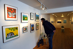 竹上さんは、動物や植物、昆虫をモチーフにした、鮮やかで味わい深い色づかいの版画十六点を出展。作品は、一枚の版木を途中まで彫り、色をつけて刷った後、少し彫り進めては異なる色で刷る、という行程をくり返して作られている。