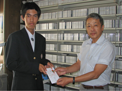 旭川明成高校の図書委員会が七月二十一日、学校祭で開いた古本市の売上金一万千二百三十円を旭川点字図書館(七ノ十四)に寄付した。図書委員長の渡邊忍君(17・三年生)と石山隆介教諭(26)が点字図書館を訪れ、宮崎伸一館長に手渡した。点字図書館への寄付は今年で三回目。