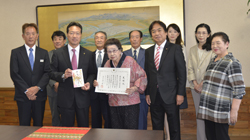当日は二川会長(92)をはじめ会員五人が市役所を訪問。市側は西川将人市長と佐藤幸輝経済観光部長、坂東元旭山動物園長が応対したほか、笠木薫市議会議長も同席した。二川会長が西川市長に寄付金が入った封筒を手渡し、西川市長は二川会長に感謝状を贈った。