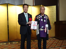 続いて北原組合長が市長寿社会生きがい基金に三十万円を寄付、目録が西川市長に手渡された。また祝宴では、木遣や纏振り、梯子乗りが披露され会場から大きな拍手が送られた。