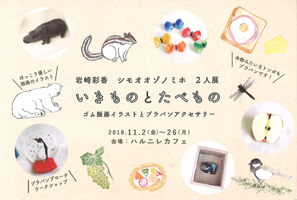 本紙に「暮らしの隅を彫る」を連載中のイラストレーター・岩崎彩香さんと、プラバンアクセサリー作家・シモオオゾノミホさんのコラボ展「岩崎彩香 シモオオゾノミホ 2人展 いきものとたべもの」が十一月二日(金)から、ハルニレカフェ(七ノ八)で開かれます。