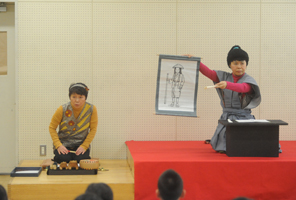 五、六年生の児童五十一人を前に、山田さんが裃(かみしも)をつけ、講談師に扮して張り扇で釈台を叩いて怪談話を披露。石井さんは、その音響効果を担当。太鼓で雪の音、箱に小豆を入れて波の音を表現するなど、二人の息はぴったり。子どもたちは、食い入るように見入っていた。
