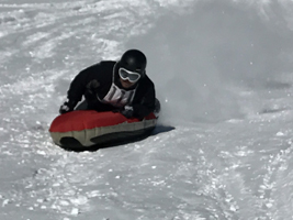 今年で九回目の開催。うつぶせでボードに乗り、ゲレンデを自在に滑走する「エアボード」。大会専用コースを二回滑走し、タイムで順位を決めます。