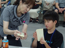 講座は、六人ずつのグループに分かれ、自己紹介から始まり、スクリーンを使ったお金の歴史を学ぶ座学や、お金にまつわるクイズ、模擬紙幣を数える札勘(さつかん)など五つのプログラムを行った。模擬紙幣を実際に手にした札勘では、同金庫スタッフが「数え方は、横勘と縦勘の二つあります」と模範演技。子どもたちはスタッフの指導を受けながら、一生懸命取り組んだ。