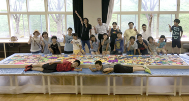 大町小学校(大町一ノ一)で五日、「大町小でみんなの宝物をつくろう♪」と題して、巨大絵画の制作が行われた。