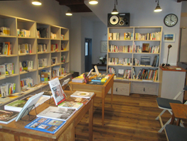 本屋とコーヒー店の間には、小さな窓のついた仕切りがある。本屋には椅子を置き、ゆっくりと読書もできる。気に入った本を購入後は、コーヒーを飲みながら、ゆっくりと…。