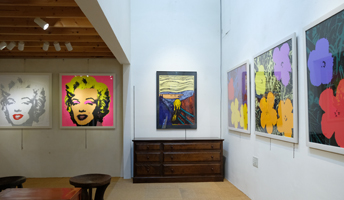 今回の展示では、ウォーホルの定番「マリリン・モンロー」や「フラワー」 シリーズのほか、同ギャラリーで初めて取り扱う「ドルサイン」シリーズや「叫び」など十六点が並びます。作品は全て購入可能で、価格は六万五千~九万円(税別)です。サイズ(横×縦)は、「ドルサイン」=四五・五×五六・〇㌢、「マリリン・モンロー」、「フラワー」=九七・六×九七・六㌢、「叫び」=七三・三×一三〇・五㌢。