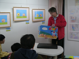 「絵本のぶひ原画展」が開催されている、こども冨貴堂(七条買物公園)のギャラリーキッズで二十八日、作者の永井利幸さん(56)の講演と手遊びの会が開かれた。親子連れなど、十五人ほどが参加した。