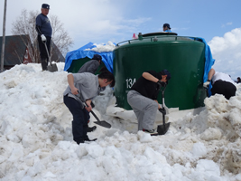 髙砂酒造(宮下十七)の蔵人たちが二十三日、美瑛町美馬牛の山中で、雪の中から原酒を入れたタンクを掘り出す作業に汗を流した。