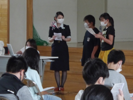 新型コロナウイルス対策として、体育館と特別教室に学年ごとに分かれて集まった児童たちに向けて、整備士やキャビンアテンダント、パイロットがそれぞれの仕事の内容や飛行機について話した。