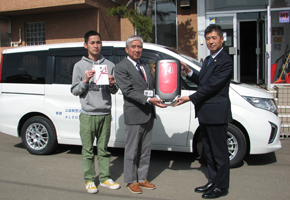 この日、同社北海道支社の長尾昭支社長が今野理事長にホンダ・ステップワゴン(八人乗り、寒冷地仕様)の目録とリモコンキーのレプリカを手渡した。