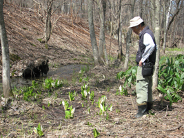 忠別川の湿地に咲くミズバショウを四十年近く観察してきた北島さんは、「カモやヤマバト、ネズミなどがミズバショウを食べるのを見ました。自宅のビオトープで育てたミズバショウも数株、特定の場所に移植したところ、毎年、美しい仏炎苞(ぶつえんほう=白い花のように見える部分)を見せるまで成長しているものもあります。ミズバショウの寿命は四十年と言われています。小さな花にも一つの命があります。大事に見守り、残していきたい植物のひとつです」と笑顔で話す。(佐久間和久)