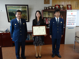 尾谷さんは感謝状を手に、「犯人が捕まったわけでもないから感謝状なんて…と思いましたが、主人が『すごくいいことをしたんだよ』と言ってくれましたし、周りの人にこうしたことが知らされれば、犯罪の防止につながるかと思って、いただくことにしました」とはにかみながら話した。(工藤稔)