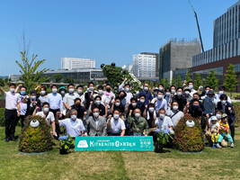 冒頭、尾野理事長が「七十年という長い歴史を紡いで来られた諸先輩からお預かりしたバトンを、未来へ渡せるよう願いを込めた事業です。感謝の気持ちを込めて一つ一つの苗を植えていきたいと思います」と挨拶。青空の下、ガーデン内の鏡池周辺に苗を植えた。(工藤森)