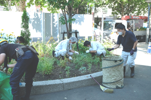 作業は、一年草などの枯れた草花の抜き取りのほか、センター前の歩道の清掃、建物周辺の草刈りなどを同社の社員が手分けして行った。