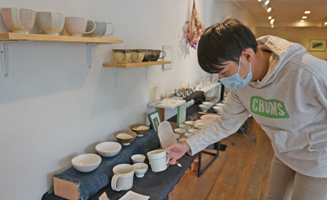 市内の福祉施設で働く佐藤涼さん(22)は、学生時代からたびたび同ギャラリーを訪れる。今展で購入したマグカップについて、「同じ作家の、同じデザインのマグカップが並んでいますが、手に持った感じはそれぞれ違うんですよ」と語る。
