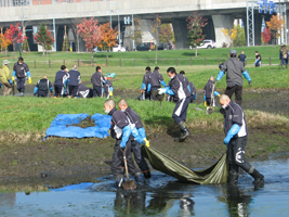 参加したのは一、二年生の部員三十九人。午前九時半、長靴を履きゴム手袋をして、水を抜いた鏡池に入り、作業を開始。しっかりと根を張っている葦などの雑草をスコップで表土ごと取り除き、根の土を池の水で洗い落としてブルーシートの上に集めた。そして山と積まれた雑草を載せたシートをゴミ収集車が待つ道路ふちまで二~四人一組で引っ張った。