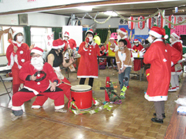 この日は、クリスマスが近いとあって皆さんサンタクロース姿。三々五々、集まって来た会員は次々と楽器や鳴り物を取り出し演奏を始めた。