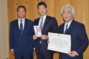 山本社長(61)と江夏秀則副社長(59)が市役所を訪れ、今津寛介市長に目録を手渡し、今津市長から感謝状が贈られた。