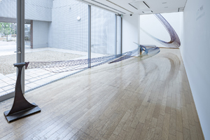 チタン合金の線材をトラス状に継ぎ合わせて弧を描いた、長さ十㍍と八㍍の二つの立体作品が一組になった作品。作者が「たなびく雲や霧、空気をイメージした」という作品は、弧が先に向かうにつれて細くなり空間に吸い込まれるような形状で、可動式の継ぎ目により、人がそばを通るほどのかすかな空気の動きで上下に揺れる仕掛けになっている。