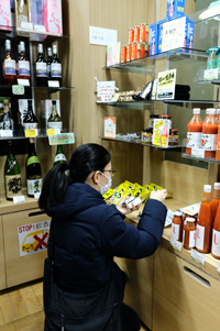実践編となる最終回は、新型コロナ感染拡大による日程変更の影響などから参加者が五人に減少。道の駅売店内の一角に用意された「市民参加型の棚」で、「市民が選ぶ私の推し」をコンセプトに、商品の選定や商品説明用のPOP製作を行った。棚には、谷口農場のトマトジュース「ゆうきくん」や共成製菓の「旭豆」など、参加者やACCのメンバーそれぞれが推す商品八種が並ぶ。この棚は約二カ月間、継続して設置される予定だという。
