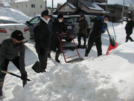 二月二十五日、「金星 高齢者いこいの家」(東三ノ七)の周りを除雪する作業が行われた。午前九時、いこいの家近くの郵便局長を中心に七人が集合。各々が持参したママさんダンプやスコップを使い作業が始まった。