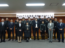 贈呈式には、ヴォレアス北海道から池田憲士郎社長、降旗雄平GMをはじめとするチームスタッフ、エドクライン監督率いる選手、計十七人が出席。池田社長は「あと一歩のところでV1昇格はなりませんでしたが、多くの人に会場まで足を運んでいただき、テレビの生中継を見ていただいたことに感謝します。次のシーズンに向け決して諦めることなくV1で優勝するという目標を達成するために頑張ります」と挨拶。その後、降旗GMからメンバーの紹介とシーズンの詳細な報告が行われた。
