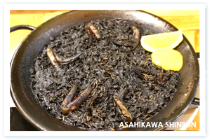 もう一品いただいたのは、イカ墨のパエリア(千九百円)。硬めに炊いた真っ黒なご飯に、イカ墨とブイヨンの旨味が複雑に絡みあって見事。鍋の直径は二十四㌢あり、二人前は十分にある。