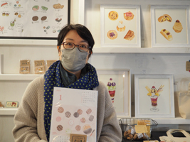 kanakoronさんの透明水彩は、やさしいタッチでスイーツの質感を巧みに表現している。コガタ食堂さんの精巧なミニチュアフードは、予想を上回る小ささに圧巻の一言。本紙で連載中の岩崎彩香さんのイラストは、版画ならではの質感がスイーツの絵と絶妙にマッチしている。在廊する丹野ゆりさんのイラストは、文字も含めてそのままメニュー表に採用したくなるほどのかわいさだ。作品はポストカード、カレンダー等の形で販売もされている。